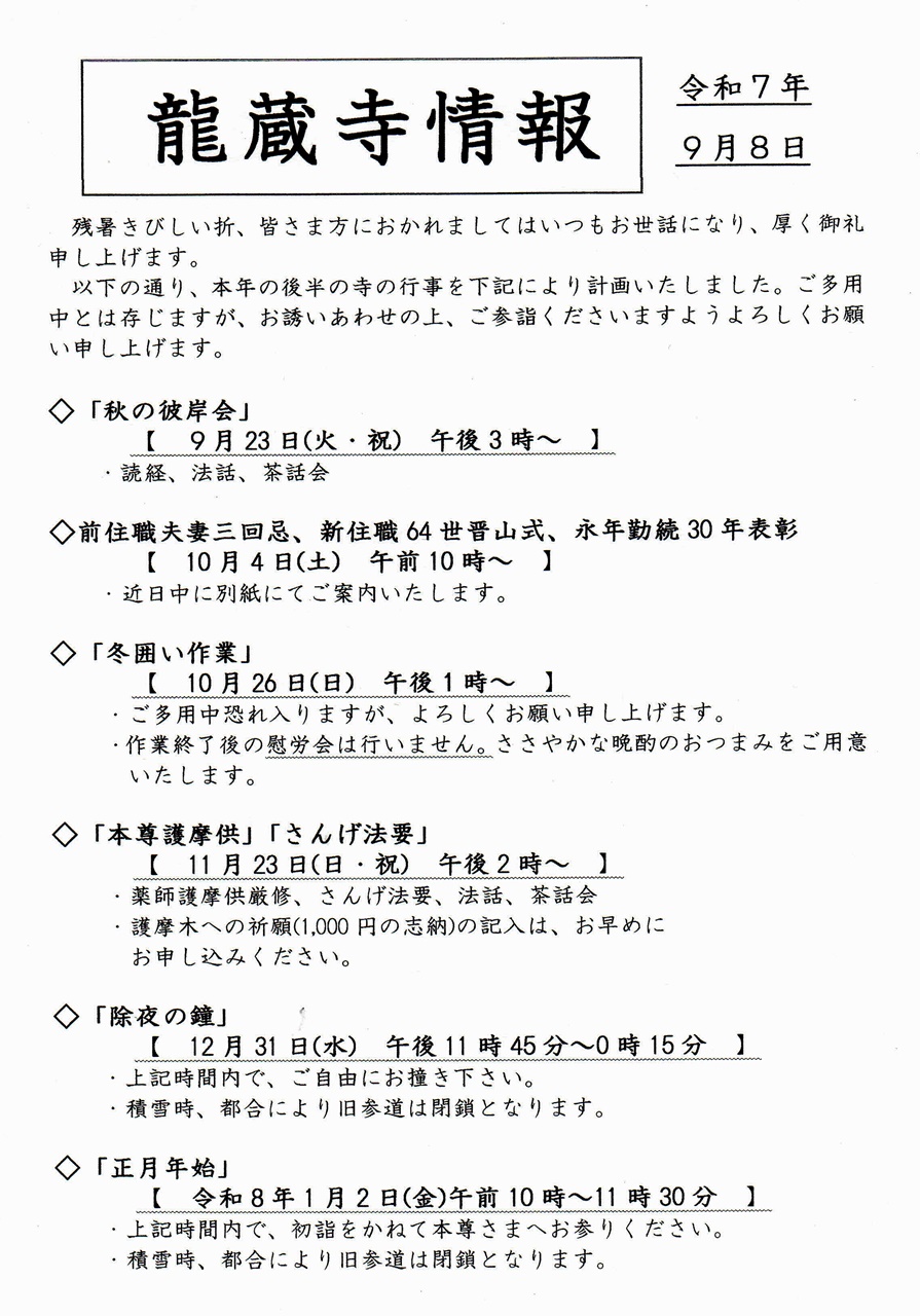 | 【 9月20日(土)~26日(金) 秋のお彼岸 】 23日(祝)彼岸会法要15:00~ |