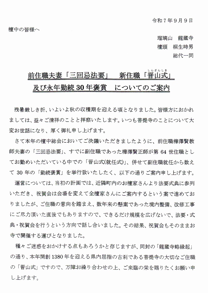 「三回忌法要」新住職「晋山式(しんざんしき)等について |